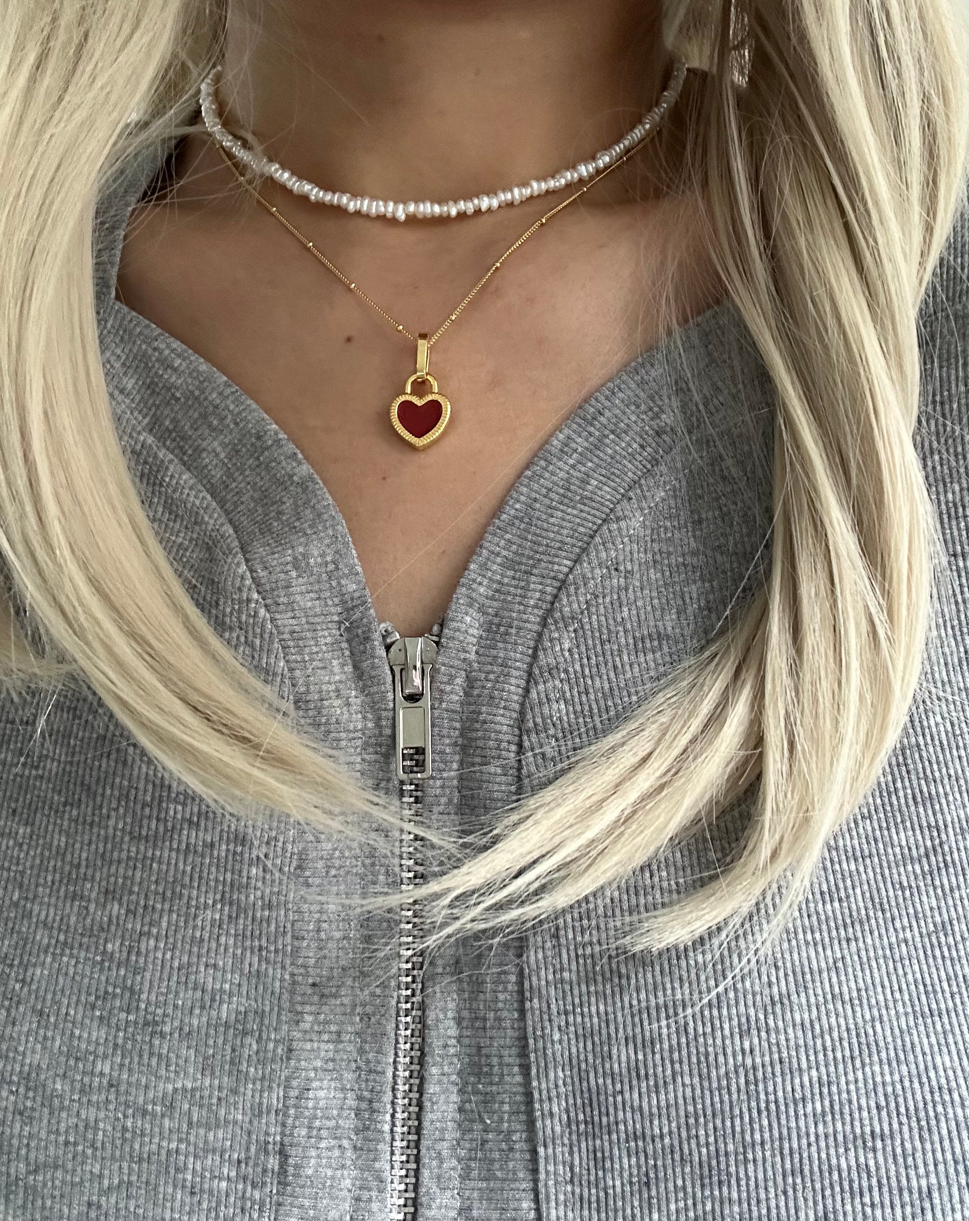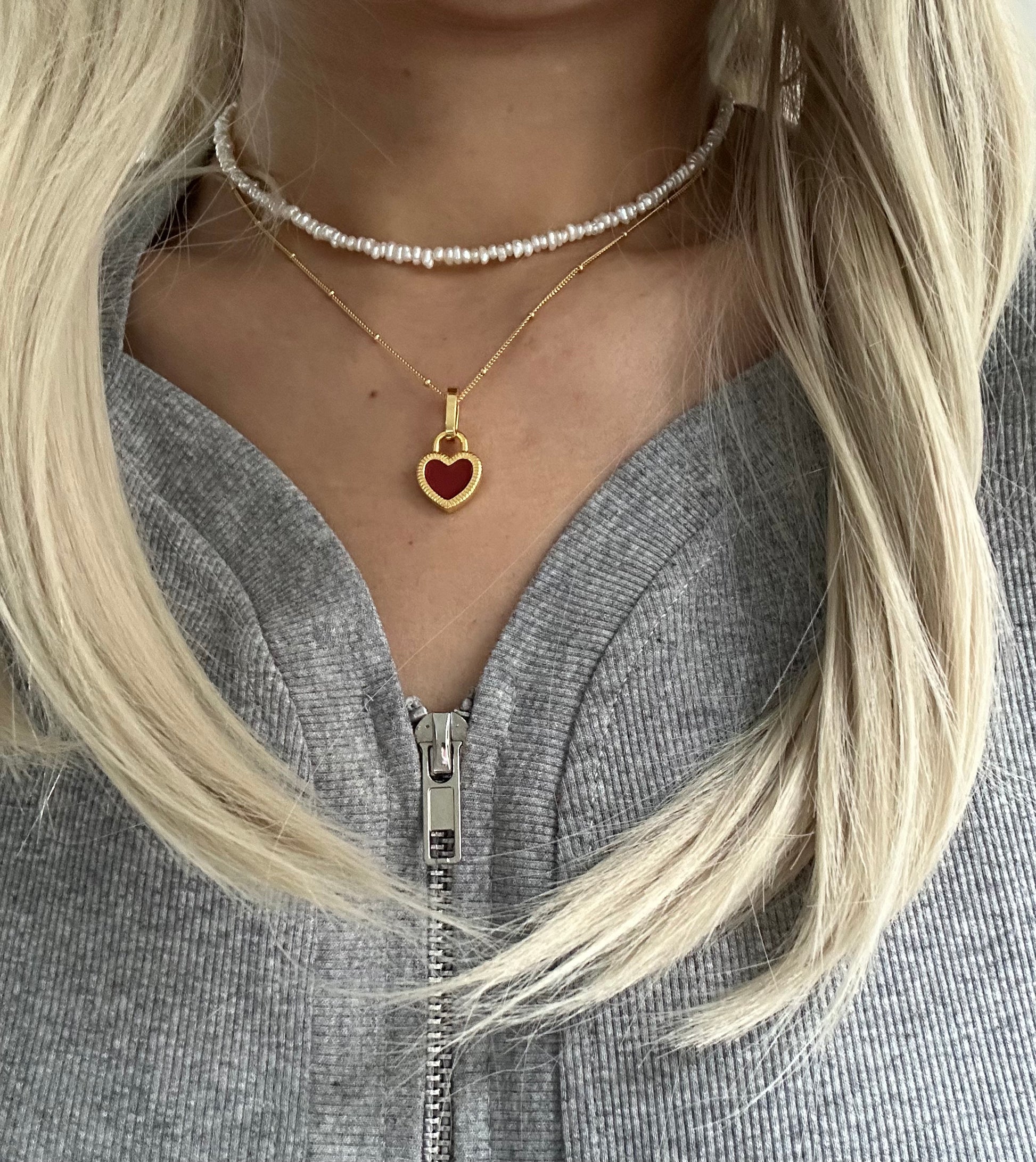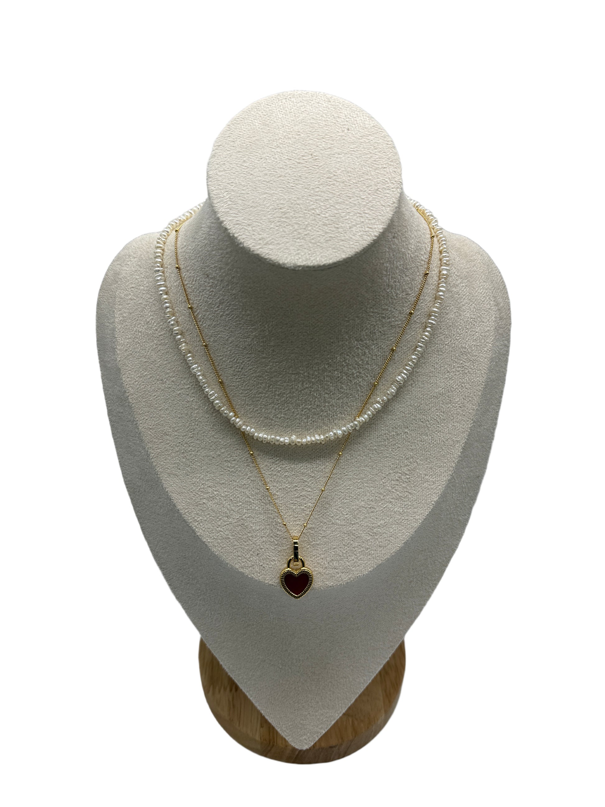 This necklace set features a double sided heart pendant with red onyx and white shell, plated in 18K gold on sterling silver, on an adjustable 43cm chain. It also includes a 3mm Baroque freshwater pearl choker with seed beads, measuring 36cm with an extender. Both pieces offer elegant, versatile style.