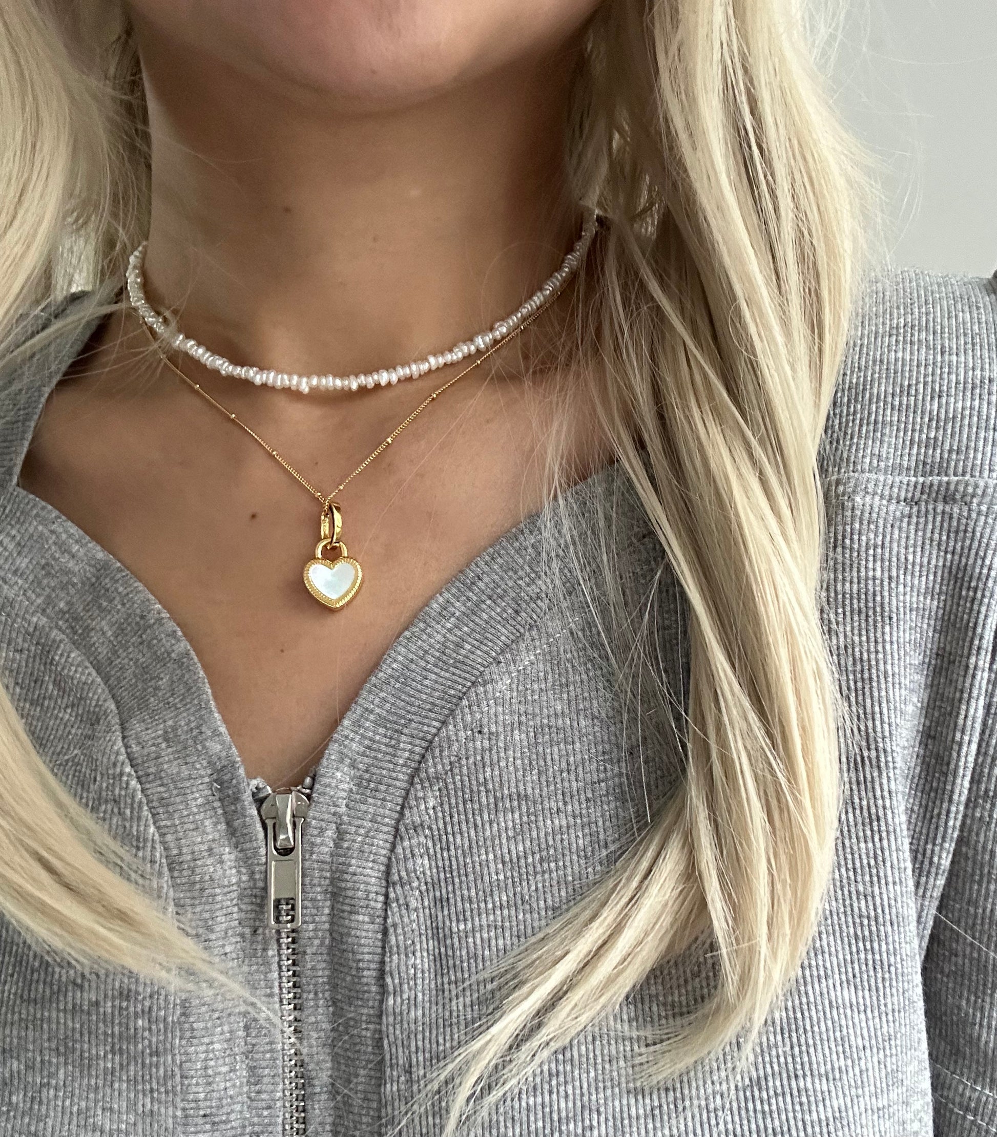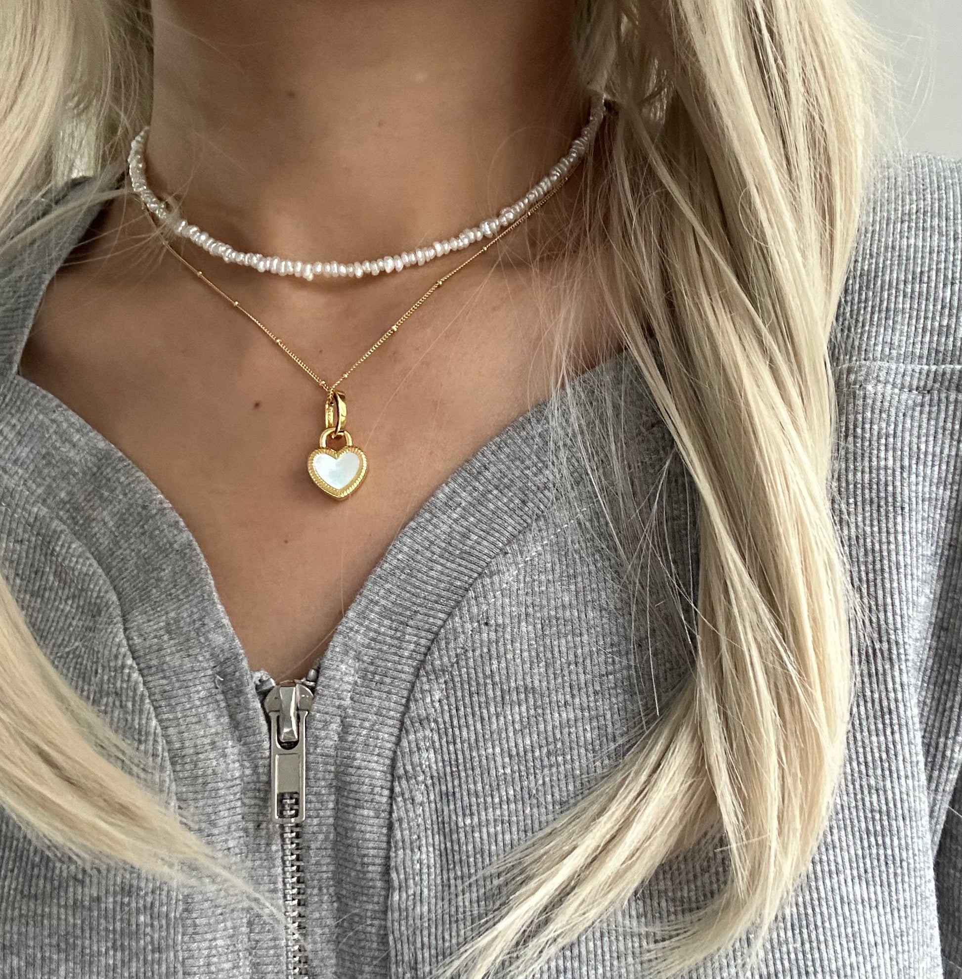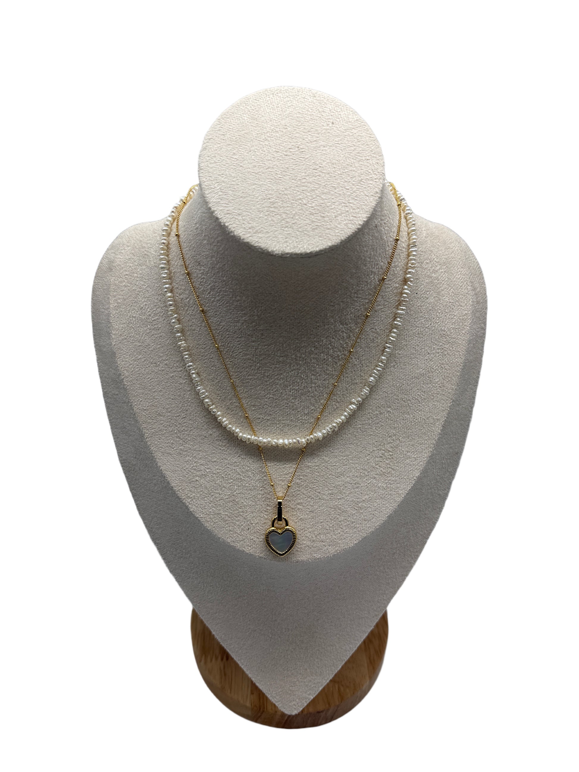 This necklace set features a double sided heart pendant with red onyx and white shell, plated in 18K gold on sterling silver, on an adjustable 43cm chain. It also includes a 3mm Baroque freshwater pearl choker with seed beads, measuring 36cm with an extender. Both pieces offer elegant, versatile style.