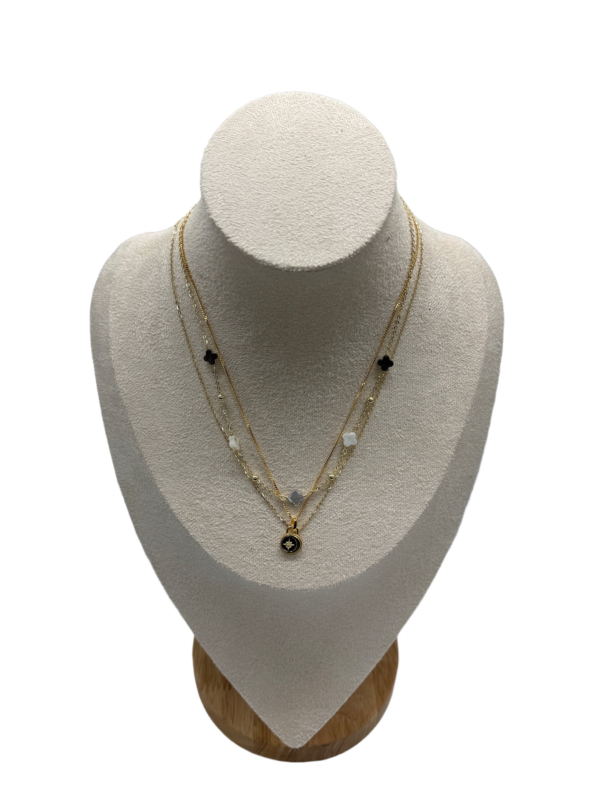 Discover two elegant gold-plated necklaces crafted from S925 sterling silver. One features a four-leaf clover with natural shells on an adjustable 40cm chain. The other showcases a star and moon design with black onyx on a 39cm chain. Both offer versatile, refined style for everyday wear or layering.