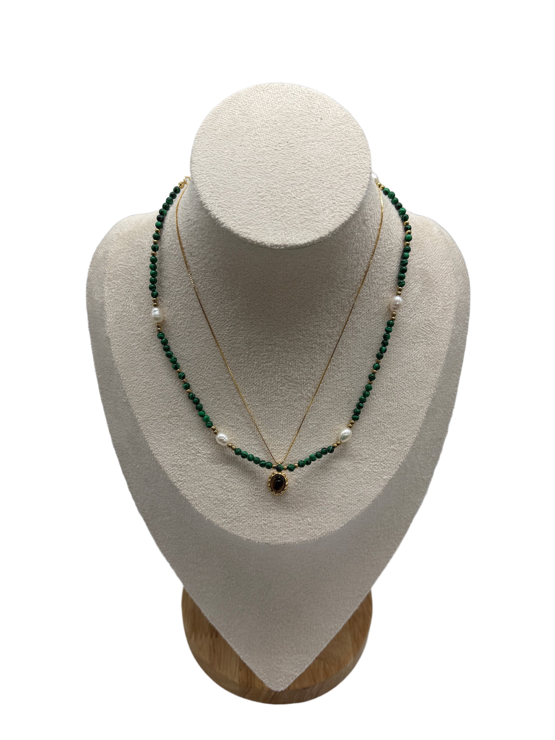 s925 Sterling Silver Gold Plated Necklaces Set: Malachite & Pearls + Tiger's Eye