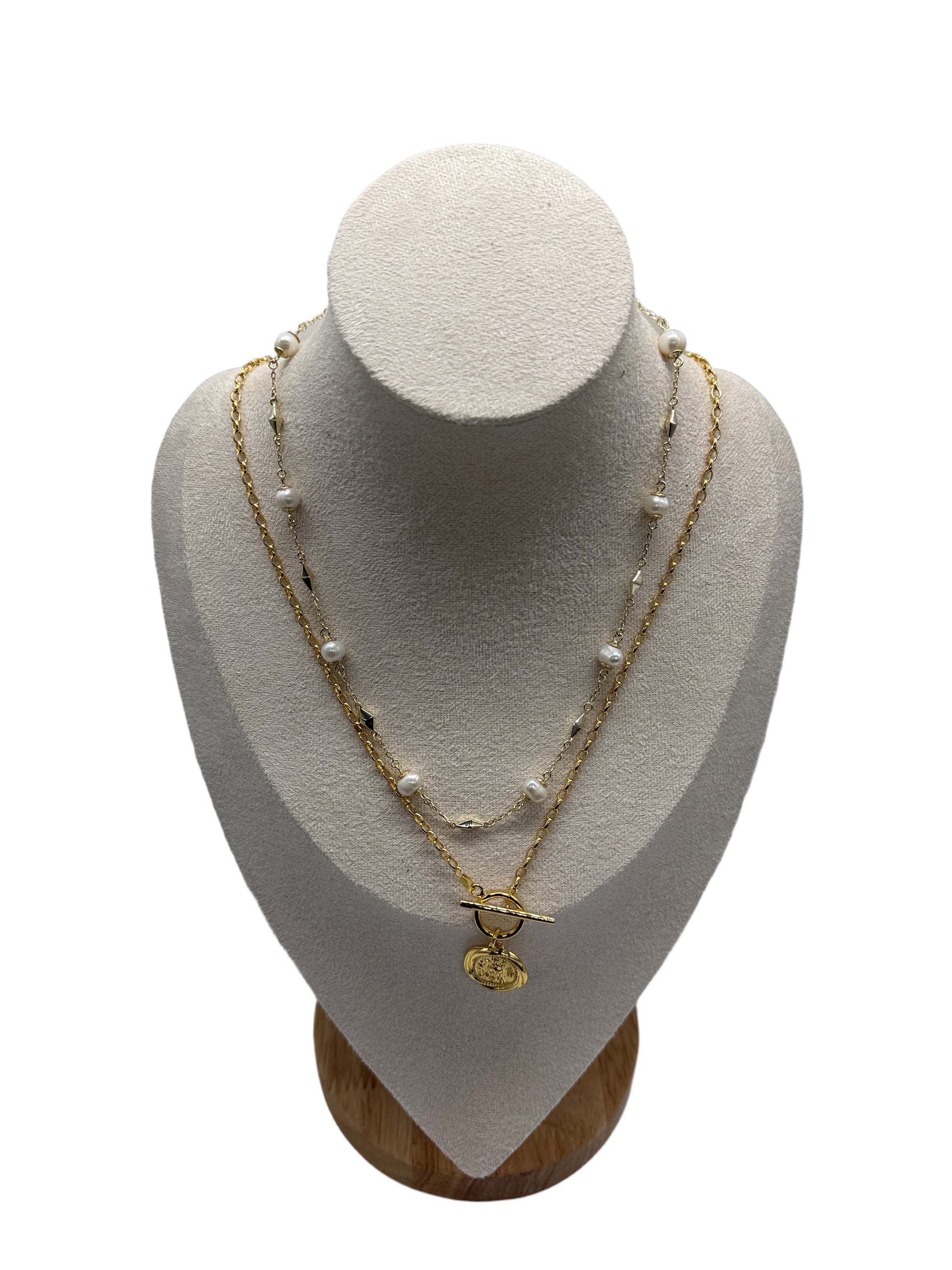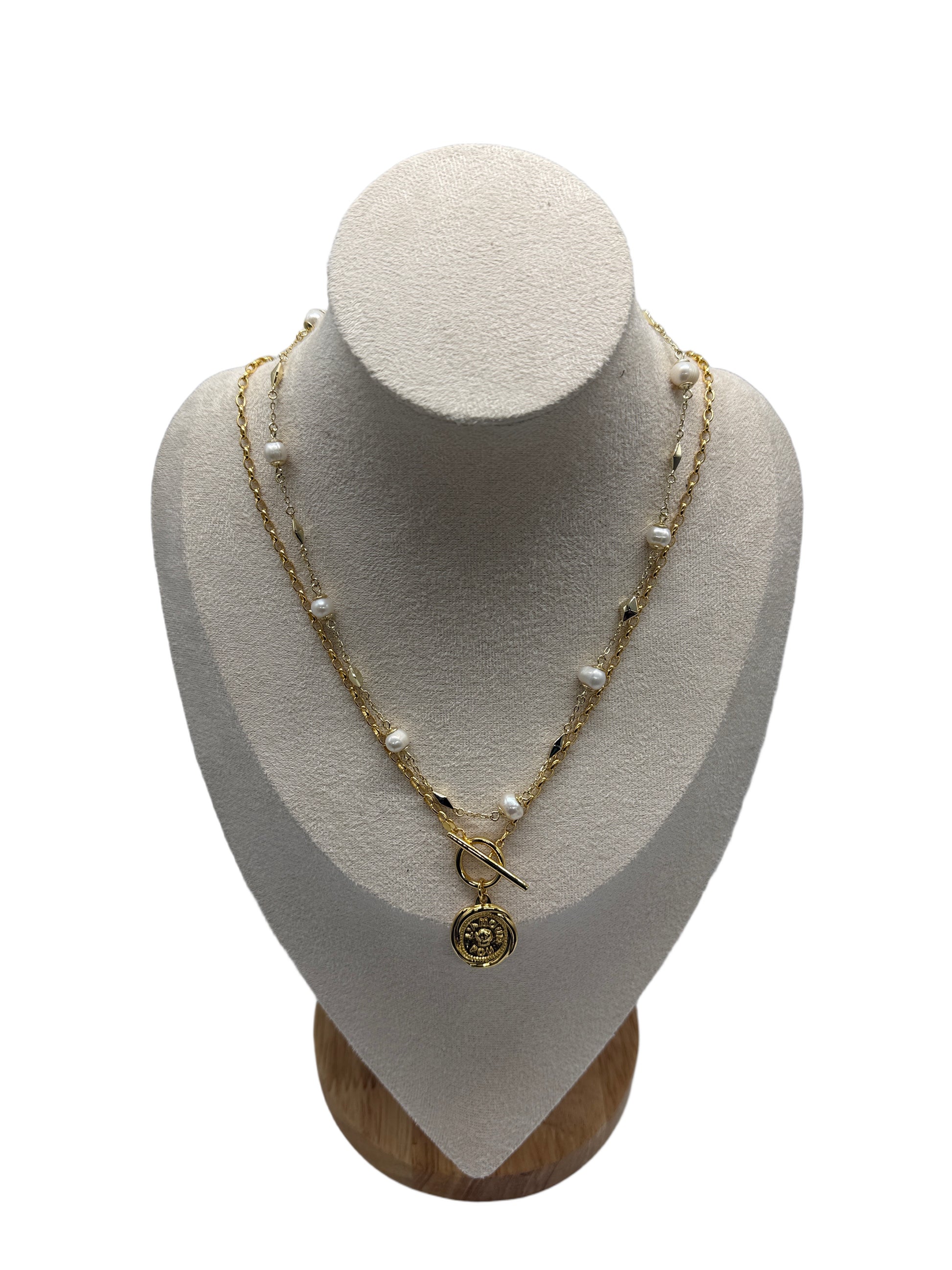 s925 Sterling Silver Gold Plated Necklaces Set: Natural Pearls & Rose Flower Embossed Coin