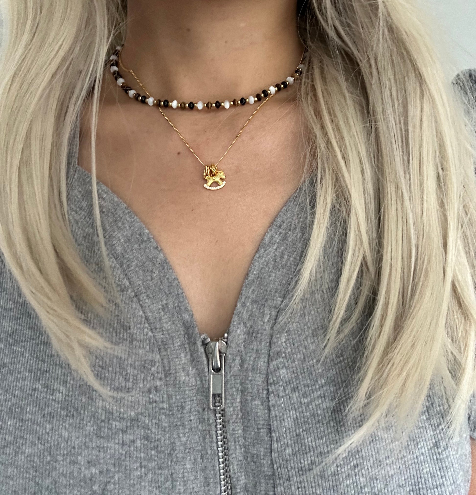 This elegant set features two gold-plated S925 sterling silver necklaces: a Rocking Horse pendant with a sparkling zirconia on a 40cm adjustable chain, and a Tiger's Eye with pearl necklace. Both pieces combine timeless charm and natural beauty, perfect for layering or wearing alone with a refined touch.