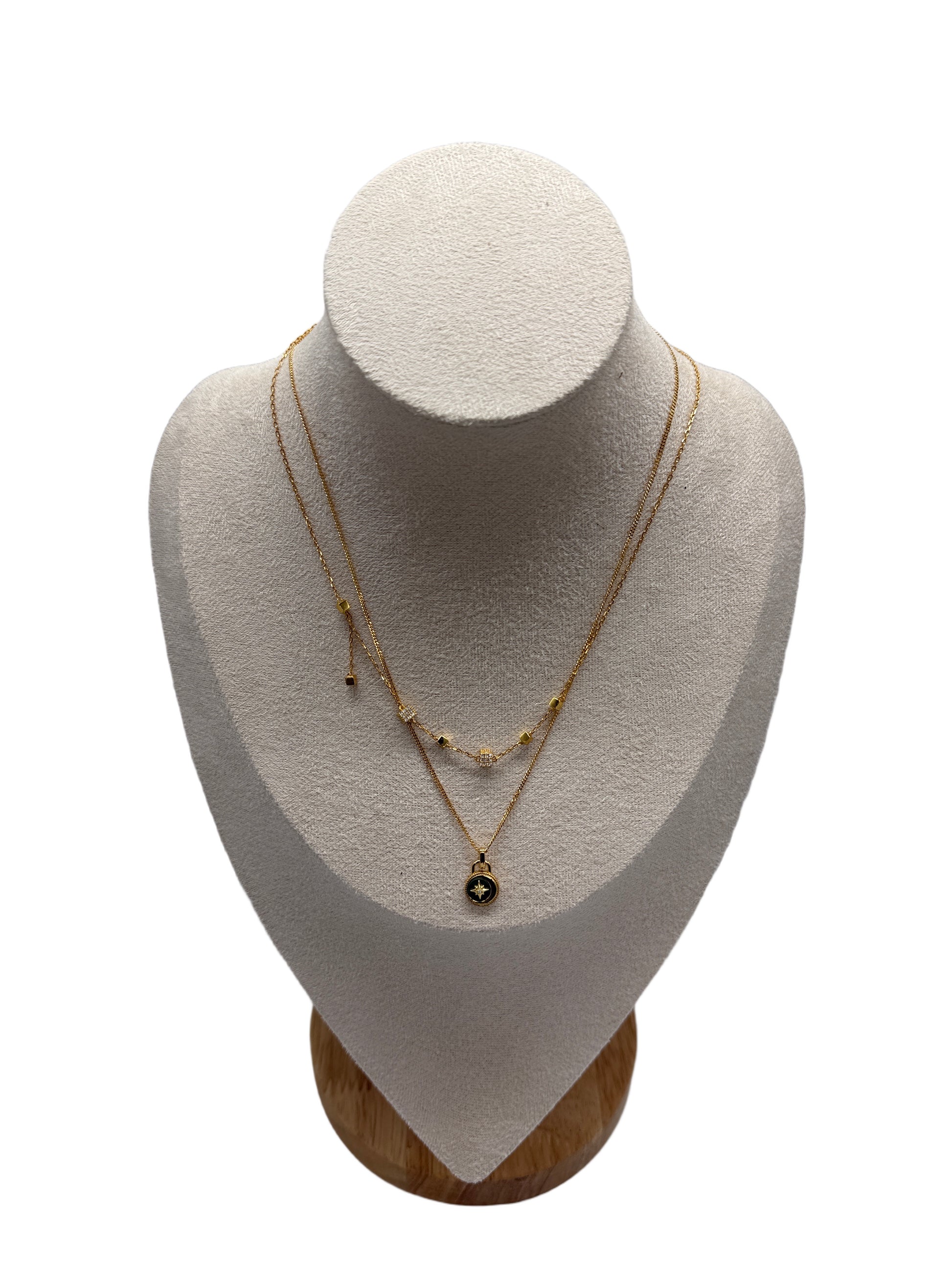 This set features two gold-plated s925 sterling silver necklaces: a small square tassel with zirconia accents and a malachite pendant with a star-moon design. Both have adjustable chains for versatile styling and layering.